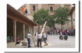 Llegado el día de San Juan el viernes por la mañana se va a traer el mayo. Por la tarde se comienza con la puesta en la plaza del ayuntamiento, que ayudados a veces con una maquina y tres cuerdas, una desde el ayuntamiento, otra del tejado del trinquete y la ultima de la calle estiran todos los asistentes para ponerlo recto. (Antiguamente se colgaba de la capota del mayo pollos, jamones y quesos y el que se atrevía a subir se lo quedaba.)