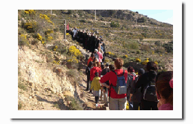 La Cruz del pueblo despide la Procesión y ésta toma ruta hacia el Hostal de la Trucha. Al llegar allí se reza en su ermita y comienza la ascensión de la Solana. A mitad se para para almorzar y al finalizar para 'echar trago'. Después de un llano empieza la bajada hacia el Barranquico, donde nuevamente se para para beber vino y prepararse para los momentos especiales que vendrán a continuación.