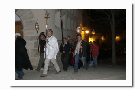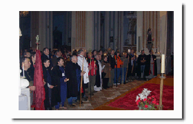 - Cánticos: Además de las oraciones rezadas por el cura, en diversos puntos del camino un cofrade canta en latín y el resto le responden. Estas son las estrofas: